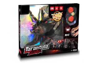 Mega Tarantule RC na dálkové ovládání. Rozměry 26,5x24x8 cm. Infračervený port. Světelné efekty očí. 4xAAA baterie do tarantule a 3xAAA baterie do ovladače nejsou součástí. Provoz až 60 min, dosah 8 m. Ovladač - tlačítko chůze dopředu, tlačítko chůze dozadu, tlačítko otáčení vlevo, tlačítko otáčení vpravo, tlačítko demo režim, přepínač kanálů A,B,C. Přepínač ON/OFF na spodní straně tarantule.
