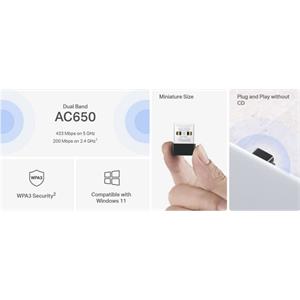 Dvoupásmová Wi-Fi Rychlost až 867 Mb/s (5 GHz) + 400 Mb/s (2,4 GHz) Plug and Play Nano velikost Mnohem menší než běžný USB flash disk Zabezpečení WPA3 Kompatibilita se systém Windows 11,10 (32/64bit)