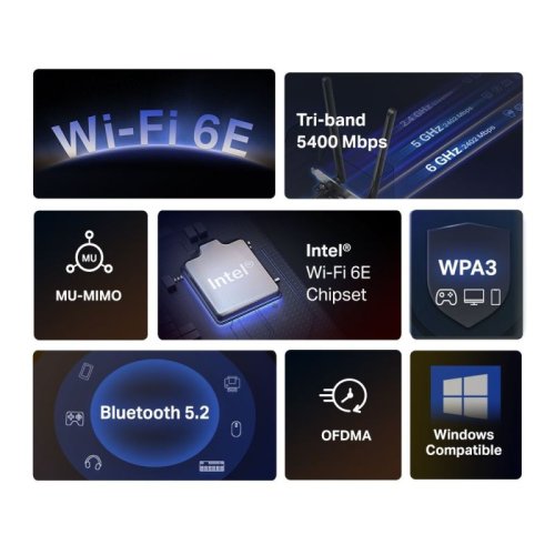 Ačkoliv je karta podporována operačními systémy Windows 10 a 11, výhod 6GHz pásma lze využít pouze v systému Windows 11. Karta není z důvodu osazení fixními anténami kompatibilní s low-profile úchytem.