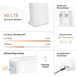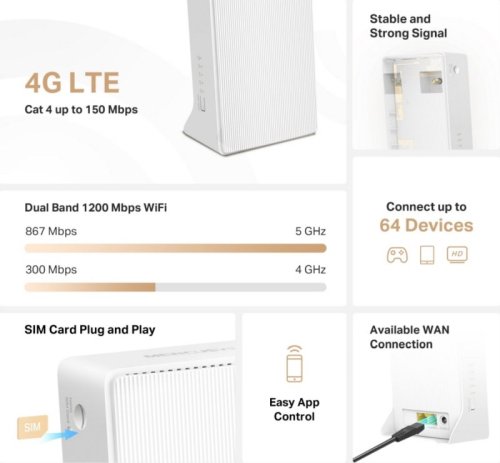 Využívejte internet naplno kdekoliv s 4G LTE routerem Mercusys MB130-4G, který Vás připojí k LTE síti rychlostí až 150Mbps download a 50Mbps upload. Pro zajištění stabilního mobilního připojení umožňuje router připojení externích 4G LTE antén. Sdílet internet na více zařízení můžete prostřednictvím dual-band WiFi5 s rychlostí až 867Mbps v 5GHz pásmu a 300Mbps v 2,4GHz pásmu. K routeru můžete připojit další zařízení pomocí 2xLAN portů, z nichž jeden dokáže sloužit i jako WAN port pro připojení kabelového připojení. V případě využití více druhů připojení zajistíte maximální dostupnost vašeho internetového připojení, kdy v případě výpadku kabelového připojení, router přepne na LTE.