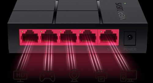 Pět 10/100Mbps automaticky přepínatelných RJ45 portů s automatickou podporou MDI/MDIX