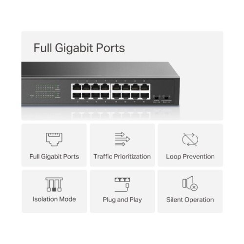 Plně gigabitové porty: 16× 10/100/1000 Mb/s port RJ45 s automatickým vyjednáváním a podporou Auto-MDI/MDIX.