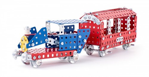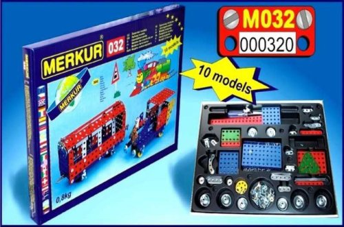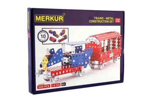 Klasická jednovrstvá stavebnice Merkur 32 – železniční modely. Stavebnice obsahuje součástky potřebné pro stavbu modelů vlaků. Součástí stavebnice je návodová knížka s návodem na stavbu 10 různých modelů. Tato jedinečná sada je ideálním nástrojem pro rozvoj technických dovedností a představivosti dětí. Stavebnice obsahuje kvalitní kovové díly, které se snadno spojují šroubky, což podporuje rozvoj jemné motoriky, logického myšlení a soustředění. Počet dílků: 300. Úroveň Merkur obtížnosti: 3. Barvy, velikost a vzhled výrobku se mohou lišit oproti uvedeným fotografiím. Baleno v krabičce. Rozměry balení: 26 x 36 x 3 cm. Nevhodné pro děti mladší 3 let. Věk: 5+