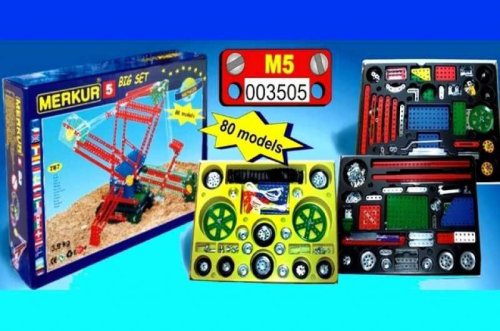 Třívrstvá klasická velká stavebnice. Stavebnice obsahuje všechny součástky jako Merkur M4 a ještě celou řadu dalších součástek jako jsou pásy, velká kola, dlouhé úhelníky, pásky atd. Součástí stavebnice je velká návodová knížka s návodem na stavbu 80 různých modelů jako je bagr, kolesové rypadlo, nákladní automobil, pásový traktor, jeřáb atd. Stavebnice obsahuje 768 dílků. Vhodné i pro děti, které s Merkurem začínají. Se sestavenými modely si lze hrát, jsou velmi odolné. Rozměr balení: 36 x 27 x 8 cm. Nevhodné pro děti mladší 3 let. Věk: 5+