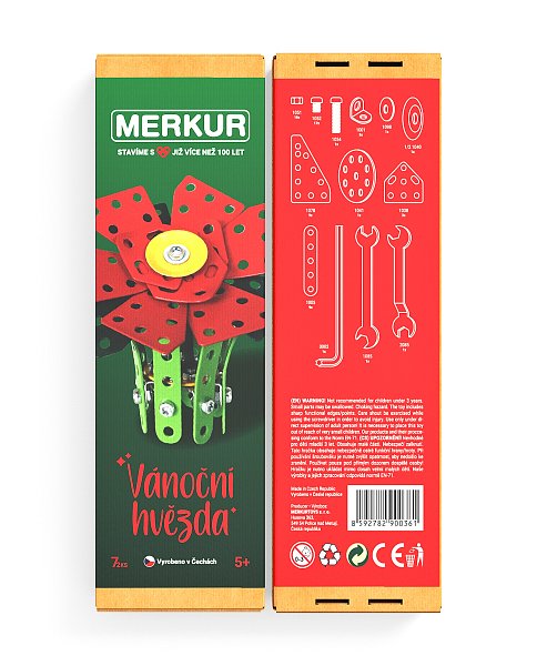 Kovová stavebnice Merkur Vánoční hvězda je malý sváteční projekt pro každého. Roztomilý model v barevném balení přináší radost i výzvu – střední obtížnost zaručí příjemné chvíle při sestavování. Stavebnice obsahuje kvalitní kovové díly, které se snadno spojují šroubky, což podporuje rozvoj jemné motoriky, logického myšlení a soustředění. Sada obsahuje: 72 dílků. Úroveň Merkur obtížnosti: 3. Baleno v krabičce. Rozměry modelu: 7 x 9 x 9 cm. Rozměry balení: 21,5 x 7 x 2,7 cm. Nevhodné pro děti do 3 let. Věk: 5+
