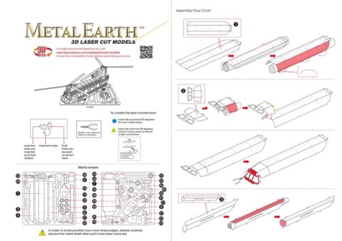 Jednotlivé díly vyjměte z kovových plátků, v případě potřeby použijte malé štípací nůžky (nejsou součástí). Dílky se spojují k sobě pomocí zámků tvořených úchytem (zobáčkem) a otvorem. Zobáček ohněte pomocí malých tenkých kleští (nejsou součástí) a postupně spojte všechny zámky až vznikne velmi realistický mistrovský kousek!