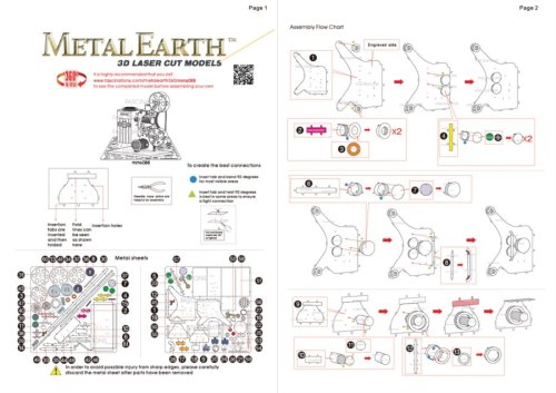 Jednotlivé díly vyjměte z kovových plátků, v případě potřeby použijte malé štípací nůžky (nejsou součástí). Dílky se spojují k sobě pomocí zámků tvořených úchytem (zobáčkem) a otvorem. Zobáček ohněte pomocí malých tenkých kleští (nejsou součástí) a postupně spojte všechny zámky až vznikne velmi realistický mistrovský kousek!