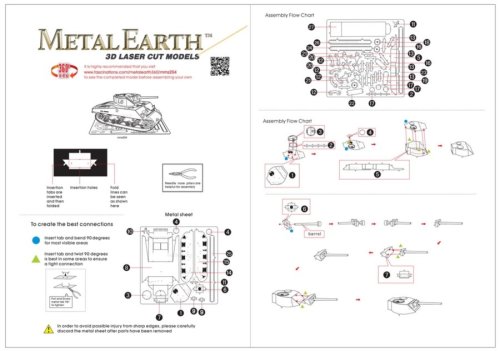Jednotlivé díly vyjměte z kovových plátků, v případě potřeby použijte malé štípací nůžky (nejsou součástí). Dílky se spojují k sobě pomocí zámků tvořených úchytem (zobáčkem) a otvorem. Zobáček ohněte pomocí malých tenkých kleští (nejsou součástí) a postupně spojte všechny zámky až vznikne velmi realistický mistrovský kousek!