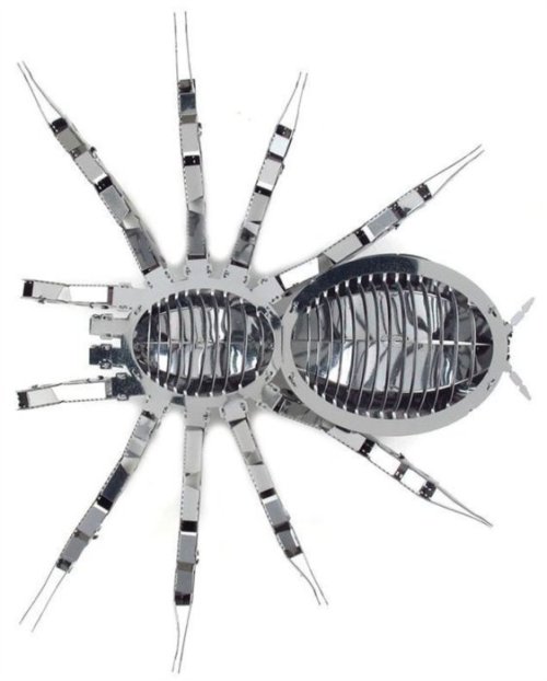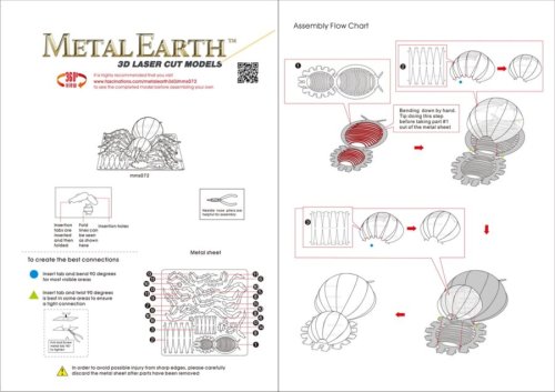 Jednotlivé díly vyjměte z kovových plátků, v případě potřeby použijte malé štípací nůžky (nejsou součástí). Dílky se spojují k sobě pomocí zámků tvořených úchytem (zobáčkem) a otvorem. Zobáček ohněte pomocí malých tenkých kleští (nejsou součástí) a postupně spojte všechny zámky až vznikne velmi realistický mistrovský kousek!