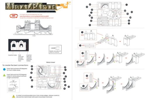Jednotlivé díly vyjměte z kovových plátků, v případě potřeby použijte malé štípací nůžky (nejsou součástí). Dílky se spojují k sobě pomocí zámků tvořených úchytem (zobáčkem) a otvorem. Zobáček ohněte pomocí malých tenkých kleští (nejsou součástí) a postupně spojte všechny zámky až vznikne velmi realistický mistrovský kousek!