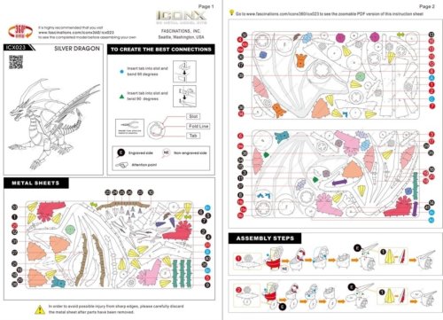Jednotlivé díly vyjměte z kovových plátků, v případě potřeby použijte malé štípací nůžky (nejsou součástí). Dílky se spojují k sobě pomocí zámků tvořených úchytem (zobáčkem) a otvorem. Zobáček ohněte pomocí malých tenkých kleští (nejsou součástí) a postupně spojte všechny zámky až vznikne velmi realistický mistrovský kousek!