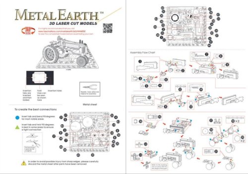 Jednotlivé díly vyjměte z kovových plátků, v případě potřeby použijte malé štípací nůžky (nejsou součástí). Dílky se spojují k sobě pomocí zámků tvořených úchytem (zobáčkem) a otvorem. Zobáček ohněte pomocí malých tenkých kleští (nejsou součástí) a postupně spojte všechny zámky až vznikne velmi realistický mistrovský kousek!