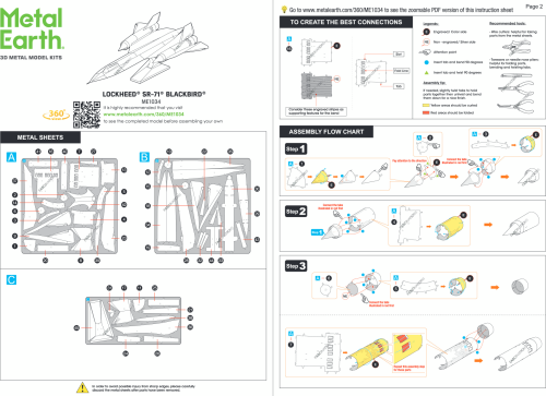 Sada pro vytvoření fascinujícího kovového 3D modelu . Stavba puzzle METAL EARTH vyžaduje trpělivost a šikovné ruce. Výsledek práce však plně vyváží vynaložené úsilí. Miniaturní repliky jsou působivou a poutavou dekorací. Z čtvercových plátků oceli Vám pod rukama vyrostou detailně propracované, fascinující modely. Autentický vzhled 3D puzzle METAL EARTH je dosažen díky detailnímu laserovému gravírování . Nářadí není součástí balení. PRACOVNÍ POSTUP: Jednotlivé díly vyjměte z kovových plátků, v případě potřeby použijte malé štípací nůžky (nejsou součástí). Dílky se spojují k sobě pomocí zámků tvořených úchytem (zobáčkem) a otvorem. Zobáček ohněte pomocí malých tenkých kleští (nejsou součástí) a postupně spojte všechny zámky až vznikne velmi realistický mistrovský kousek!