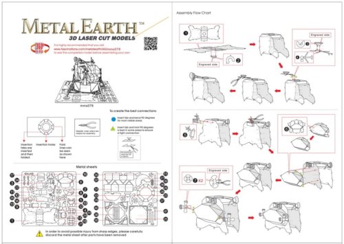 Jednotlivé díly vyjměte z kovových plátků, v případě potřeby použijte malé štípací nůžky (nejsou součástí). Dílky se spojují k sobě pomocí zámků tvořených úchytem (zobáčkem) a otvorem. Zobáček ohněte pomocí malých tenkých kleští (nejsou součástí) a postupně spojte všechny zámky až vznikne velmi realistický mistrovský kousek!