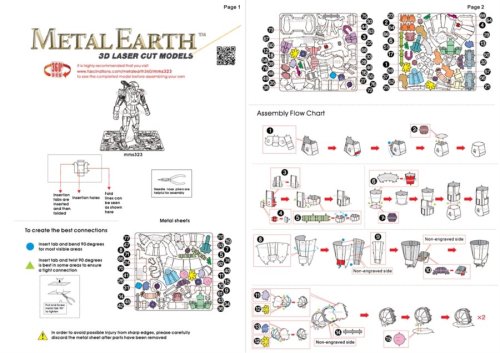 Jednotlivé díly vyjměte z kovových plátků, v případě potřeby použijte malé štípací nůžky (nejsou součástí). Dílky se spojují k sobě pomocí zámků tvořených úchytem (zobáčkem) a otvorem. Zobáček ohněte pomocí malých tenkých kleští (nejsou součástí) a postupně spojte všechny zámky až vznikne velmi realistický mistrovský kousek!