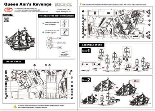 Jednotlivé díly vyjměte z kovových plátků, v případě potřeby použijte malé štípací nůžky (nejsou součástí). Dílky se spojují k sobě pomocí zámků tvořených úchytem (zobáčkem) a otvorem. Zobáček ohněte pomocí malých tenkých kleští (nejsou součástí) a postupně spojte všechny zámky až vznikne velmi realistický mistrovský kousek!