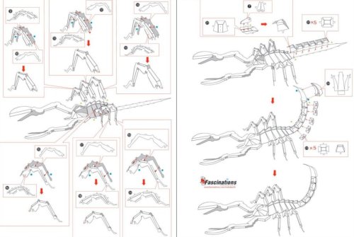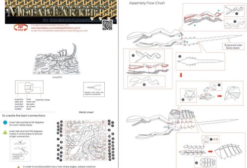 Jednotlivé díly vyjměte z kovových plátků, v případě potřeby použijte malé štípací nůžky (nejsou součástí). Dílky se spojují k sobě pomocí zámků tvořených úchytem (zobáčkem) a otvorem. Zobáček ohněte pomocí malých tenkých kleští (nejsou součástí) a postupně spojte všechny zámky až vznikne velmi realistický mistrovský kousek!