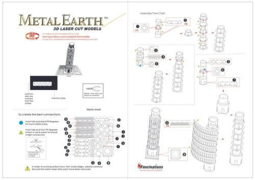 Jednotlivé díly vyjměte z kovových plátků, v případě potřeby použijte malé štípací nůžky (nejsou součástí). Dílky se spojují k sobě pomocí zámků tvořených úchytem (zobáčkem) a otvorem. Zobáček ohněte pomocí malých tenkých kleští (nejsou součástí) a postupně spojte všechny zámky až vznikne velmi realistický mistrovský kousek!