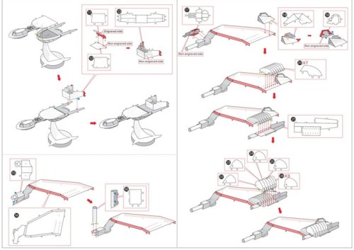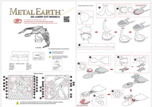 Jednotlivé díly vyjměte z kovových plátků, v případě potřeby použijte malé štípací nůžky (nejsou součástí). Dílky se spojují k sobě pomocí zámků tvořených úchytem (zobáčkem) a otvorem. Zobáček ohněte pomocí malých tenkých kleští (nejsou součástí) a postupně spojte všechny zámky až vznikne velmi realistický mistrovský kousek!