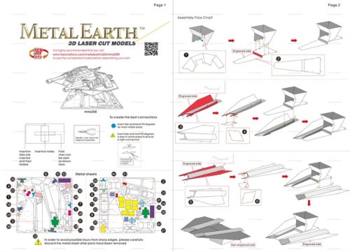 Jednotlivé díly vyjměte z kovových plátků, v případě potřeby použijte malé štípací nůžky (nejsou součástí). Dílky se spojují k sobě pomocí zámků tvořených úchytem (zobáčkem) a otvorem. Zobáček ohněte pomocí malých tenkých kleští (nejsou součástí) a postupně spojte všechny zámky až vznikne velmi realistický mistrovský kousek!