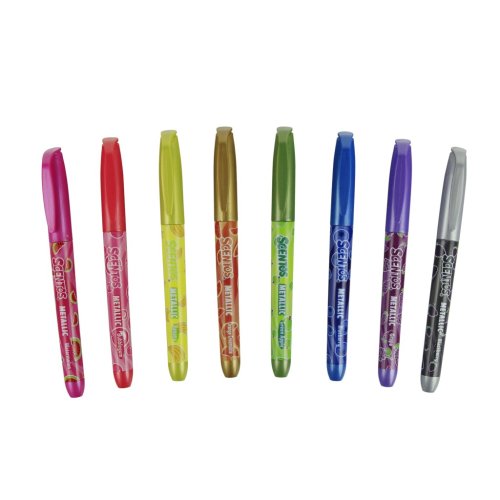 Sada metalických fixů Scentos obsahuje osm kusů barevných fixů, které vynikají nejen svým lesklým metalickým efektem, ale také příjemnou ovocnou vůní. Každý fix je opatřen výrazným barevným tělem odpovídajícím odstínu náplně, což usnadňuje výběr požadované barvy. Fixy jsou navrženy tak, aby skvěle fungovaly na různých typech papíru, včetně tmavého, kde jejich metalický lesk ještě více vynikne. Barvy jsou zářivé a třpytivé, což přidává výtvorům zajímavý vizuální efekt.