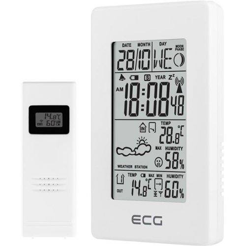 Hodiny řízené radiovým signálem, předpověď počasí, vnitřní a venkovní teplota a vlhkost, fáze měsíce, zobrazení data, budík