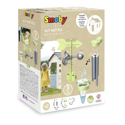 Hrací sada meteorologická stanice ke zkoumání počasí: zvonkohra, větrná korouhvička/anemometr a srážkoměr. Sada je kompatibilní se všemi domečky Smoby. S touto sadou mohou děti objevovat a pozorovat jevy počasí. Lze snadno připevnit. Sada je vyrobena z vysoce kvalitního plastu odolnému vůči UV záření a je zvláště odolná vůči povětrnostním vlivům a vyblednutí.