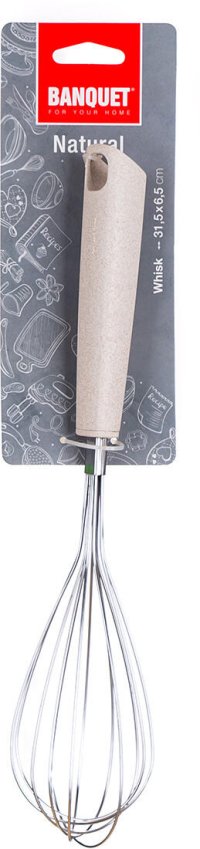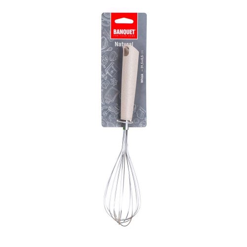 Metla šlehací NATURAL vyrobená z nerezové oceli, je určena pro profesionální i domácí použití. Metla je opatřena praktickým očkem pro možnost zavěšení, snadno se udržuje a lze mýt v myčce na nádobí. Řada kuchyňského náčiní NATURAL splňuje náročné požadavky profesionálů a je vhodná i pro domácí použití. Jednoduchý funkční design zabezpečuje nadčasovost a dlouhou morální i kvalitativní životnost všech výrobků. Držadlo je vyrobeno z polypropylenu a pšeničných otrub.