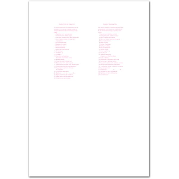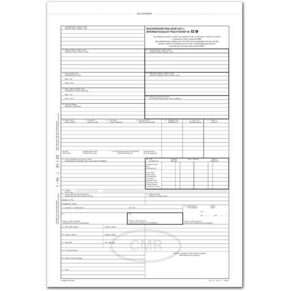 Náležitosti dle Úmluvy o přepravní smlouvě v mezinárodní silniční nákladní dopravě Samopropisovací Číslovaný Formát A4 na výšku Obsahuje 5 listů odtržitelných perforací v horní části Česko- německá …
