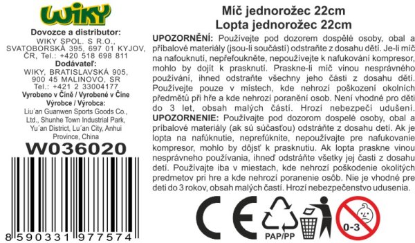 Míč gumový nenafouknutý jednorožec 22 cm. 3 barevné varianty - modrý, růžový, fialový.