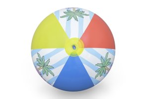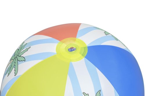Nafukovací plážový míč o průměru 51 cm je určený pro zábavu ve vodě i na zahradě. Míč je vyroben z odolného PVC materiálu, který zajišťuje dlouhou životnost a snadnou údržbu. Jeho povrch je barevně rozdělen na segmenty v modré, žluté a oranžové barvě, které jsou doplněny o světlé pruhy a motiv palem, což vytváří příjemný letní vzhled. Na jedné z barevných ploch je vyobrazen oblíbený animovaný motiv postaviček Stitche a jeho kamarádky, což míči dodává hravý a atraktivní charakter vhodný pro děti.