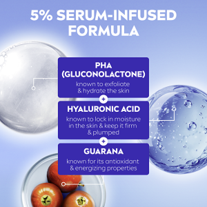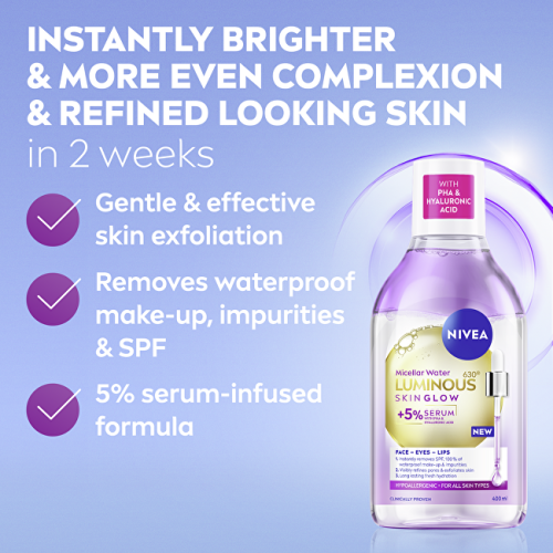 Micelární voda Luminous630 Skin Glow s 5 % sér okamžitě a důkladně odstraňuje i voděodolný make-up, SPF a nečistoty. K tomu viditelně zjemňuje póry, exfoliuje pleť a redukuje její začervenání. Spolehněte se na její účinné složení s 1 % PHA, které zajišťuje jemnou exfoliaci na povrchu pleti a zlepšuje její vzhled. Obsahuje také kyselinu hyaluronovou, ta udržuje v pleti vlhkost a zanechává ji pružnou a dlouhodobě hydratovanou. Nechybí ani revitalizující guarana, známá svými antioxidačními a povzbuzujícími účinky. Navíc má tato micelární voda unikátní vlastnost. Působí jako štít a chrání pleť před usazováním nečistot. Je bez parfemace, nemusíte ji oplachovat a je hypoalergenní.
