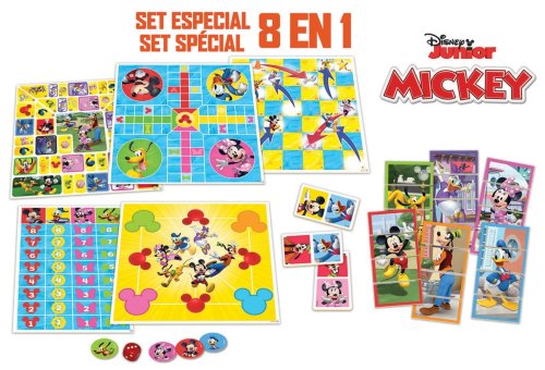EDUCA SuperPack 8v1 - to je skvělá zábava nejen pro děti! Soubor 8 různých stolních her s Mickey Mousem a jeho přáteli z animovaného seriálu Mickey a přátelé. Se souborem her EDUCA si můžete zahrát variantu Člověče, nezlob se, dětskou hru Hadi a žebříky, Husičky, Domino, Hlemýždi, Koňské dostihy, Tři v řadě a Postavy. Obsah balení: 5 herních plánů (očíslováno 1-5) 8 velkých žetonů 16 malých žetonů 28 kartiček domina 24 dílků pro 6 postav (4 pro každou postavu) 1 kostka český návod