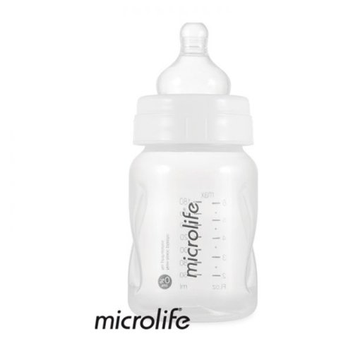 součástí výbavy je 180 ml láhev na mléko se silikonovým dudlíkem, uzávěrem a držákem na láhev
