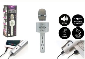 Bezdrátový karaoke mikrofon nesmí chybět na žádné párty. Pomocí kabelu nebo Bluetooth propojíte svůj telefon s mikrofonem. AUX konektor pro přehrávání hudby z mobilního telefonu, PC, tabletu nebo MP3/MP4 přehrávače. Obsahuje slot pro TF card - zapněte mikrofon delším stiskem tlačítka ON, vložte paměťovou kartu a mikrofon začne přehrávat hudbu uloženou na kartě. Můžete začít zpívat společeně s mikrofonem. AUX konektor - zapojte kabel s koncovkou do AUX slotu a druhou koncovku USB do mobilu, tabletu, PC nebo MP3. Mikrofon začne přehrávat hudbu, kterou si v připojeném zařízení vyberete a můžete začít zpívat. Při zapnutí mikrofonu Bluetooth pracuje spontánně. Pokud spojení nenaváže, hledá jiné Bt spojení. Pokud mikrofon nemůžete spárovat, zkontrolujte, zda zařízení, se kterým chcete mikrofon spárovat podporuje A2DP. Možné nastavení hlasitosti a intenzity hudby a ozvěny. Technické údaje: