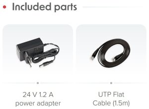 V balení naleznete 24V/1,2A napájecí adaptér a UTP Flat kabel (1,5 m) pro okamžité zprovoznění routeru.