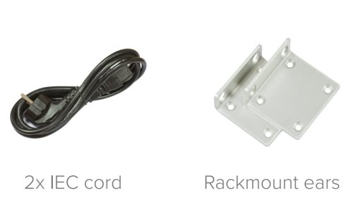 Součástí balení jsou dva držáky pro montáž do racku a dva napájecí kabely do sítě 230 V.