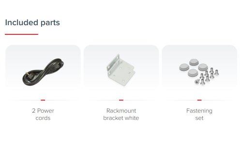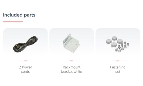 Balení obsahuje: Cloud Core Router CCR2004-16G-2S+ určený pro montáž do racku (1U), dva napájecí kabely a rackmount kit.