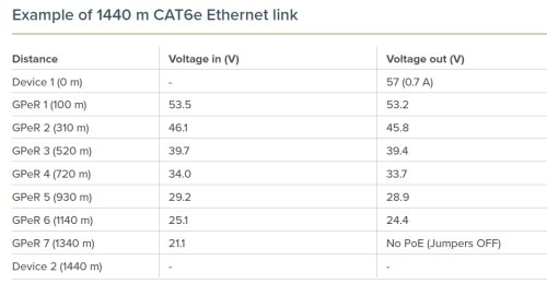 Maximální délka CAT6 Ethernet kabelu mezi GPeR jednotkou a zdrojem napájení/routerem je až 100 až 150m (dle kvality použitého kabelu). Maximální délka CAT6 Ethernet kabelu mezi dvěma GPeR jednotkami je až 210m (dle kvality použitého kabelu).