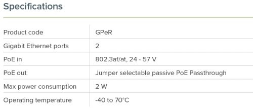 Technické specifikace: Product code: GPeR Gigabit Ethernet ports: 2 PoE in: 802.3af/at, 24 - 57 V PoE out: Jumper selectable passive PoE Passthrough Max power consumption: 2 W Operating temperature: -40 to 70°C
