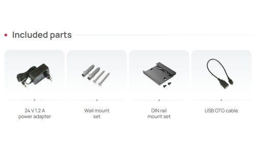 Obsah balení: napájecí adaptér (24 V/ 1,2 A), sada pro montáž na zeď, sada pro montáž na DIN lištu, USB OTG kabel