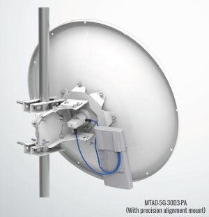 *Product PN: MTAD-5G-30D3-PA *Frequency Range: 4.7-5.875 GHz *Gain: 30 dBi typically *Dual Polarization: Vertical and Horizontal *3dB Beamwidth: +/-2.5 deg *Standards: EN 302 326 DN1, DN2, DN3, DN5 *VSWR: min. 1.4 / max. 1.8 *Port to Port Isolation: >40dB min *Front-to-Back Ratio: >30 dB *Cross Polarization: >40 dB *Power Rating: 100 watts *Impedance: 50 ohms *Elevation adjustment range: +/-15 deg