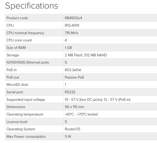 Technické specifikace: Product code: RB450Gx4 CPU: IPQ-4019 CPU: nominal frequency 716 MHz CPU core count: 4 Size of RAM: 1 GB Storage: 2 MB Flash, 512 MB NAND 10/100/1000 Ethernet ports: 5 PoE-in: 802.3af/at PoE-out: Passive PoE MicroSD slots: 1 Serial port: RS232 Supported input voltage: 10 - 57 V (two DC jacks), 12 - 57 V (PoE-in) Dimensions: 90 x 115 mm Operating temperature: -40°C .. +70°C tested License level: 5 Operating System: RouterOS Max Power consumption: 5 W