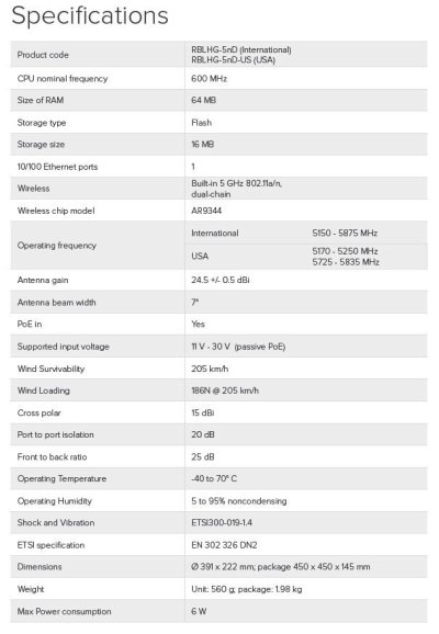 Popis produktu The Light Head Grid (LHG) je kompaktní a lehké bezdrátové zařízení s integrovanou 24,5 dBi mřížkovitou anténou zajišťující velikou ochranu proti větru. Je ideální pro point-to-point spojení nebo pro klienty / zákazníky na delší vzdálenosti.