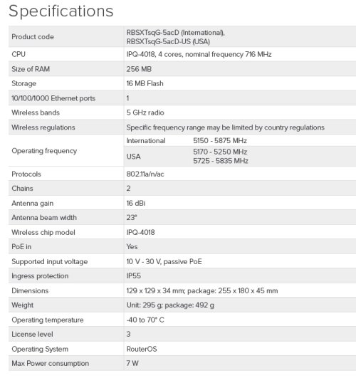 RouterBoard je umístěn v kvalitním vodotěsném, UV odolném boxu s integrovanou duální 5 GHz anténou se ziskem 16 dBi a výstupem až 25 dBm. Bezdrátový modul je vybaven přepěťovou ochranou 10 kV. Set je vhodný jak pro připojení klientů až na vzdálenost 2 km. Velkou předností je použitý standard 802.11ac, gigabitový port, velmi výkonný 4-jádrový procesor na frekvenci 716 MHz a 256 MB RAM. S těmito parametry je možné dosáhnout přenosové rychlosti až 600 Mbit. Součástí dodávky je napájecí zdroj 24 V/ 0,3 A včetně PoE.