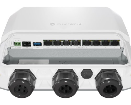 MikroTik RB5009UPr+S+OUT venkovní verze vysoce výkonného PoE routeru 7x Gigabit Ethernet port, 1x 2,5 Gigabit Ethernet, 10G SFP+, 1GB RAM, 1GB NAND, moderní čtyřjádrový CPU, 9 možností napájení, krytí IP66