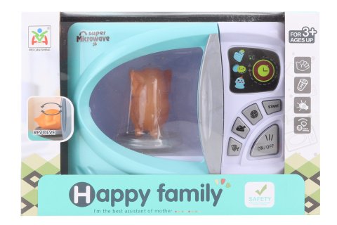 Plastová mikrovlnná trouba na baterie. Po zapnutí se točí a svítí. Součástí je také plastové kuře. Napájení na 2 AA baterie (nejsou součástí). Rozměry balení cca 25 x 17 x 14 cm. Věk 3+