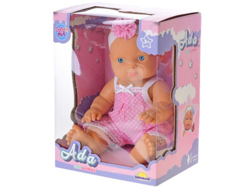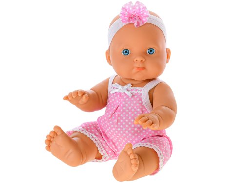 Miminko Ada s tvrdým tělem v rozkošném růžovém puntikovaném oblečku s čelenkou. Miminko je o velikosti 23 cm. Vhodné pro děti od 3 let.