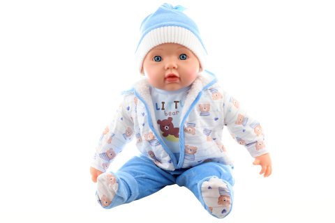 Miminko - chlapeček v krásném oblečení s motivem medvídků. Miminko má měkké tělíčko, hlavičku a části končetin z tvrdšího plastu. Velikost miminka cca 50 cm. Baleno v sáčku. Věk 3+