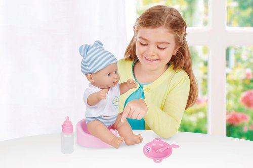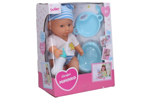 Miminko čurající. Velikost 30 cm. Miminko pije z lahvičky. Obsahuje miminko, lahvičku, nočník, talířek a lžičku. Miminko vydává 10 různých zvuků. 3xAG13 baterie součástí.